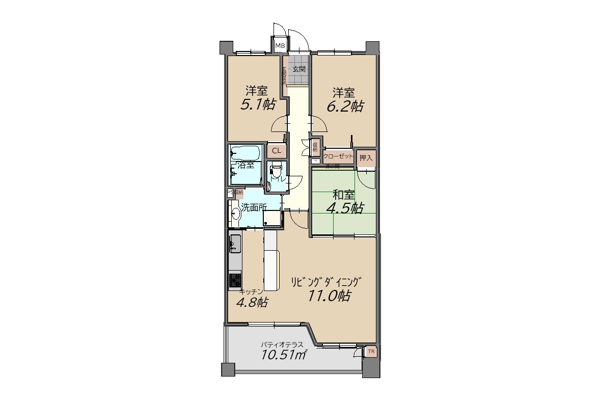 | 設備 | システムキッチン, 室内洗濯槽置場, 循環追い炊き, 自動湯張り, シャワー付き洗面化粧台, バス・トイレ別, クローゼット |